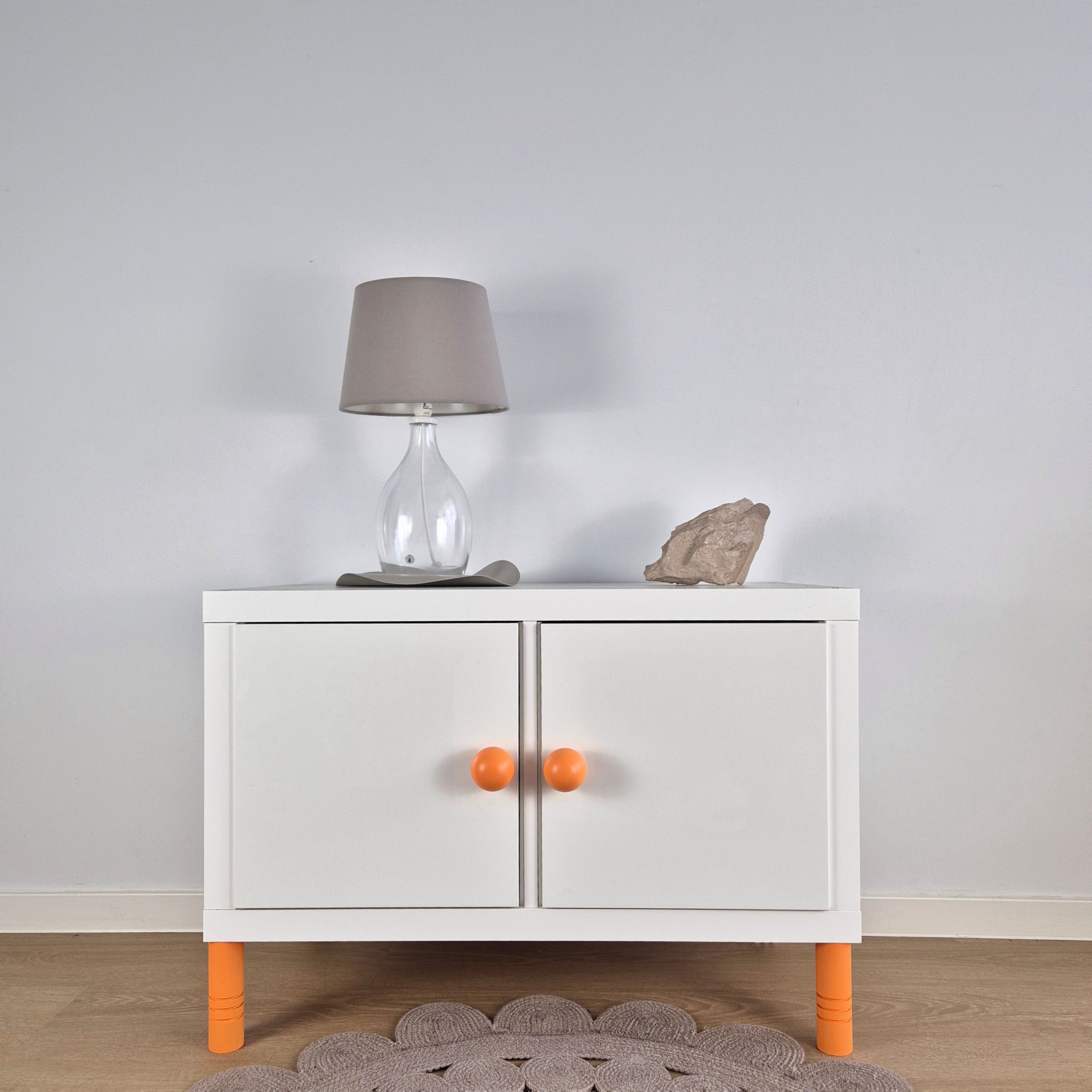 Mix and match different colors and sizes. You can find the furniture legs in the same color as this orange knob in our shop.
