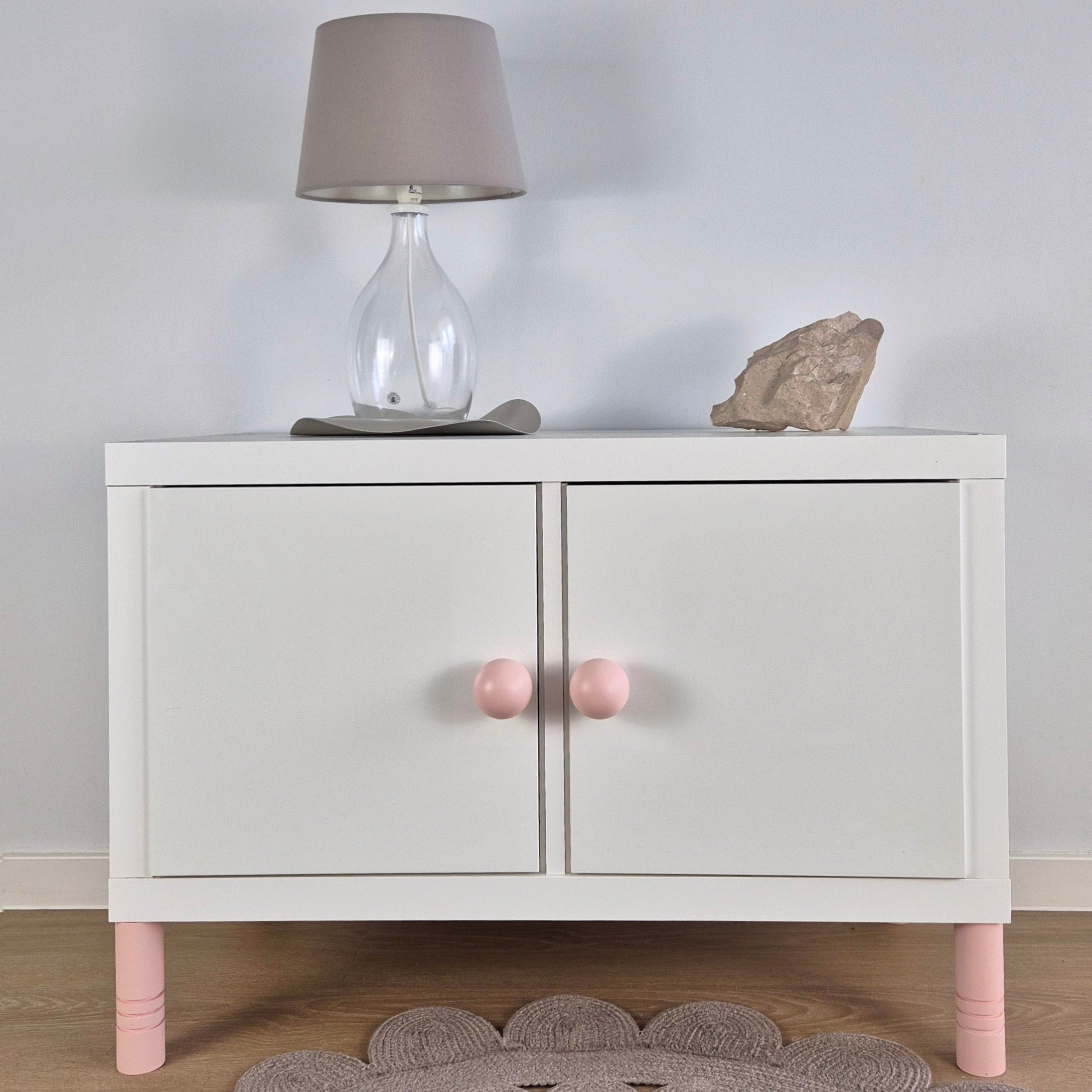 Mix and match different colors and sizes. You can find the furniture legs in the same color as this light pink knob in our shop.