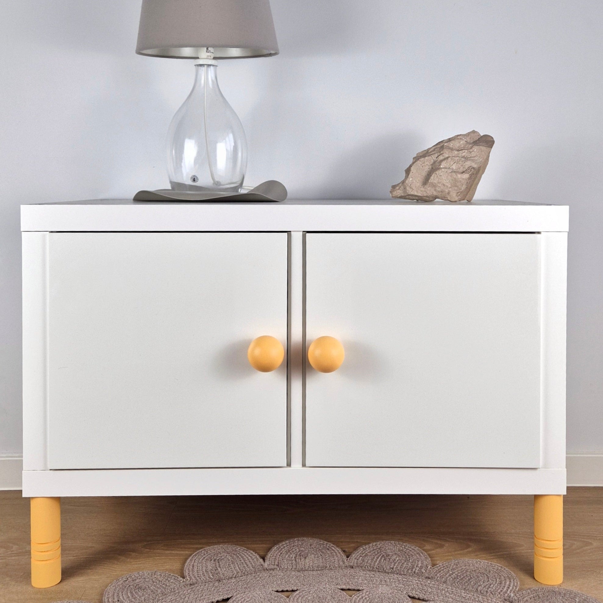 Mix and match different colors and sizes. You can find the furniture legs in the same color as this round yellow knob in our shop.